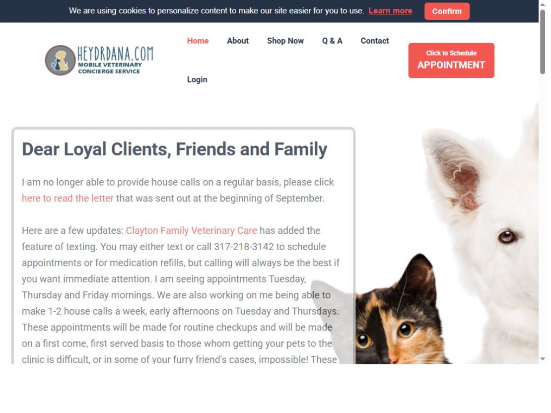 The Hey Dr Dana website is so much more than a website, as well as handling patient/customer records and S.O.A.P data it can also act as an online scheduling tool, accept payment for an appointment, generate rabies tags, PDF files and much much more!